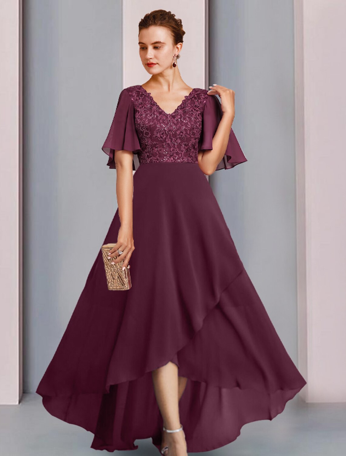 Sheath / Column Mother of the Bride Dress Wedding Guest Party Elegant V Neck Asymmetrical Chiffon Lace Half Sleeve with Pleats Sequin