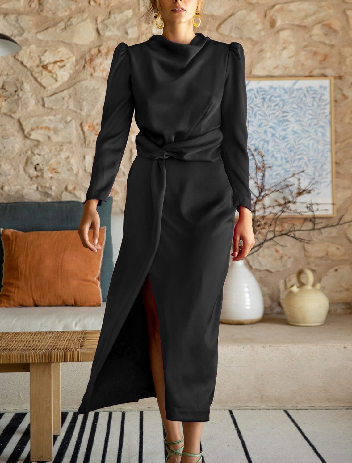 Sheath / Column Wedding Guest Dresses Minimalist Dress Party Wear Semi Formal Ankle Length 3/4 Length Sleeve High Neck Satin with Ruched Slit