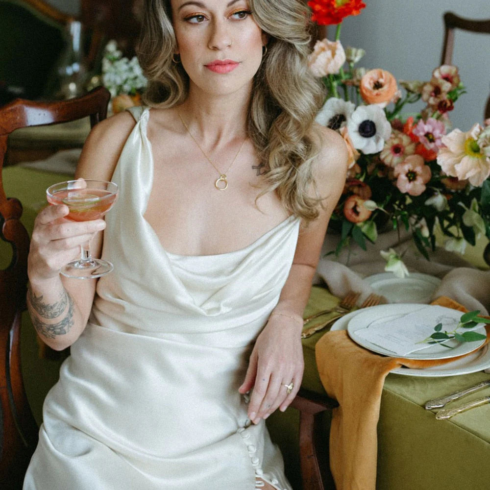 Simple One Shoulder Cowl Neck Sheath Crepe Fitted Satin Buttons Slit Wedding Dresses