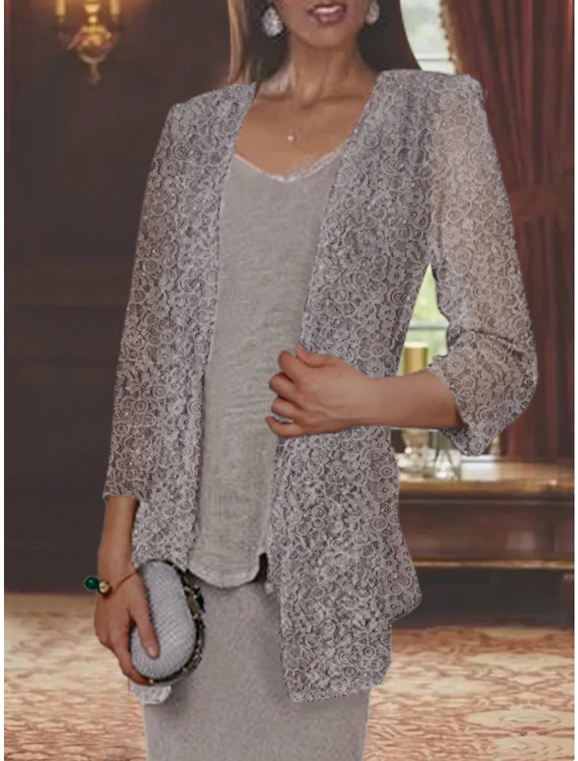 Two Piece Mermaid / Trumpet Mother of the Bride Dress Formal Wedding Guest Elegant Casual V Neck Ankle Length Lace Linen Cotton Blend Sleeveless Jacket Dresses with Ruffles Appliques